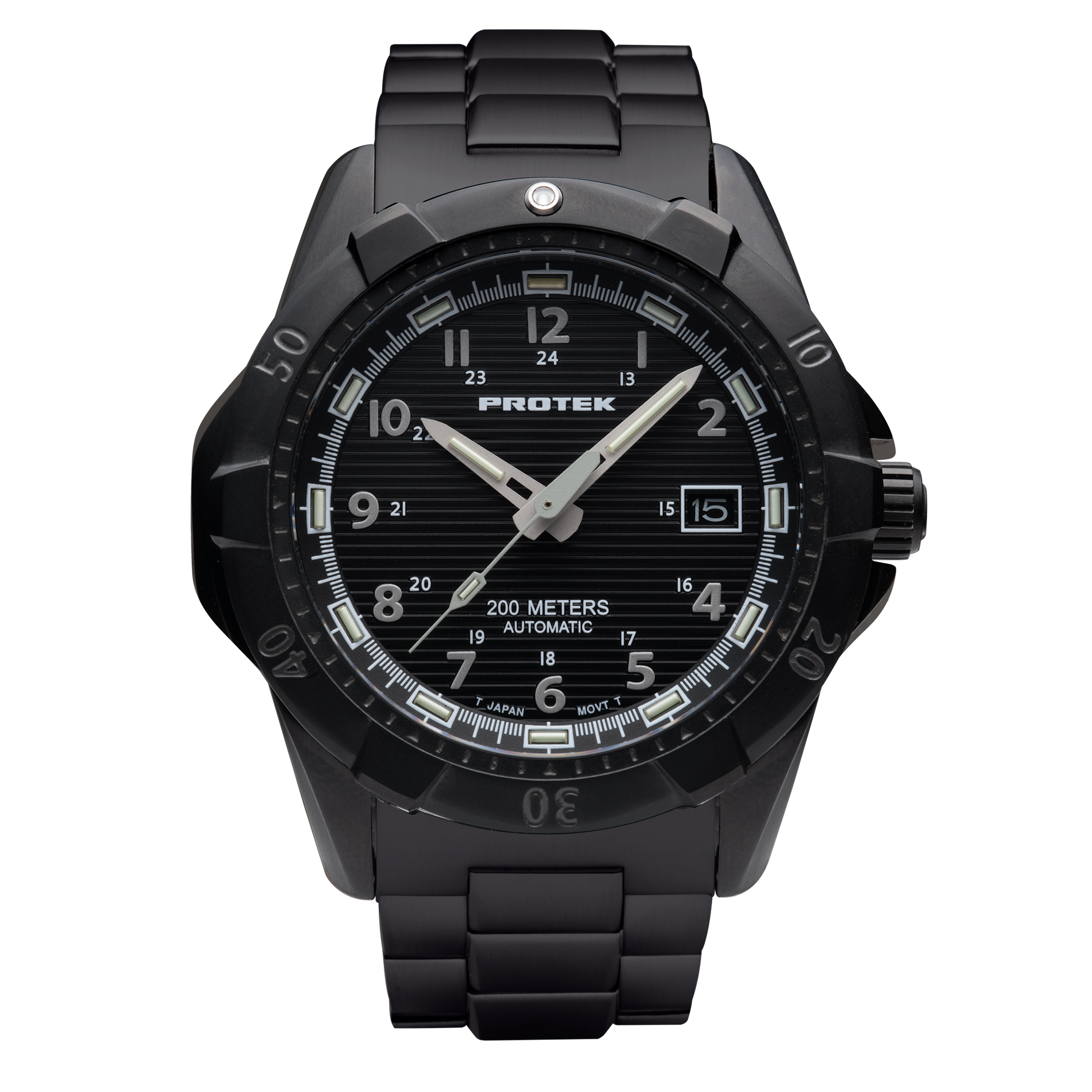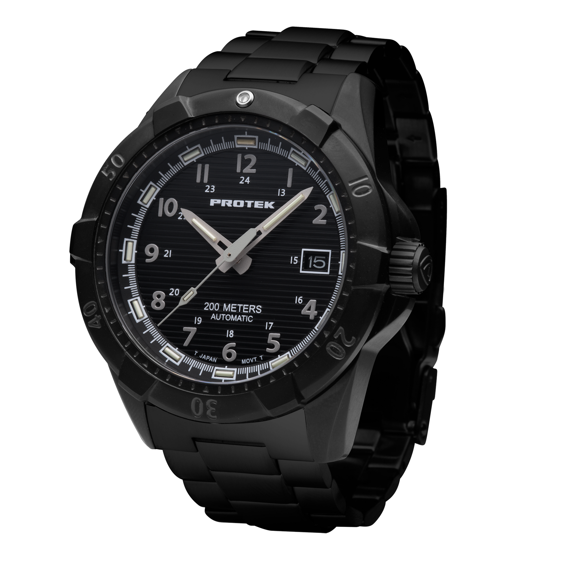 This 42mm black PVD-plated stainless steel dive watch combines bold design with exceptional performance, featuring a 120-click unidirectional bezel, 200-meter water resistance, and a reliable Seiko/TMI 24-jewel automatic mechanical movement. The Swiss Pro-Glo T25 tritium illumination ensures continuous visibility for 25 years, making it perfect for low-light environments. Paired with a solid stainless steel bracelet with Black IP Plating, this watch delivers durability and sophistication for both adventurous and everyday wear.