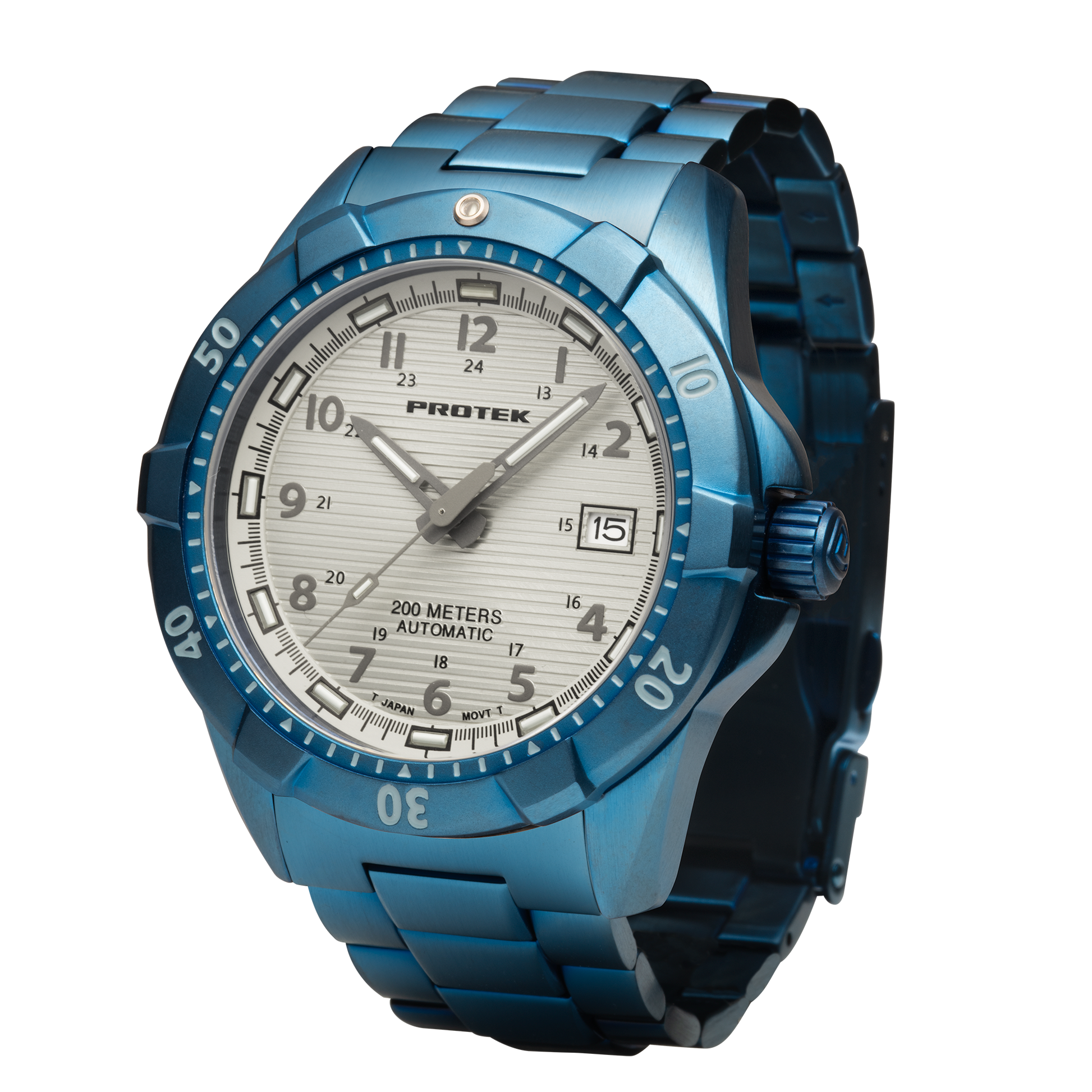 This 42mm blue PVD-plated stainless steel dive watch combines striking design with exceptional performance. It features a 120-click unidirectional bezel, 200-meter water resistance, and a reliable Seiko/TMI 24-jewel automatic mechanical movement. Equipped with Swiss Pro-Glo T25 tritium illumination for 25 years of continuous brightness, it offers superior visibility in all conditions. Paired with a solid link stainless steel bracelet with IP Blue plating, this watch blends bold style with rugged functionality.