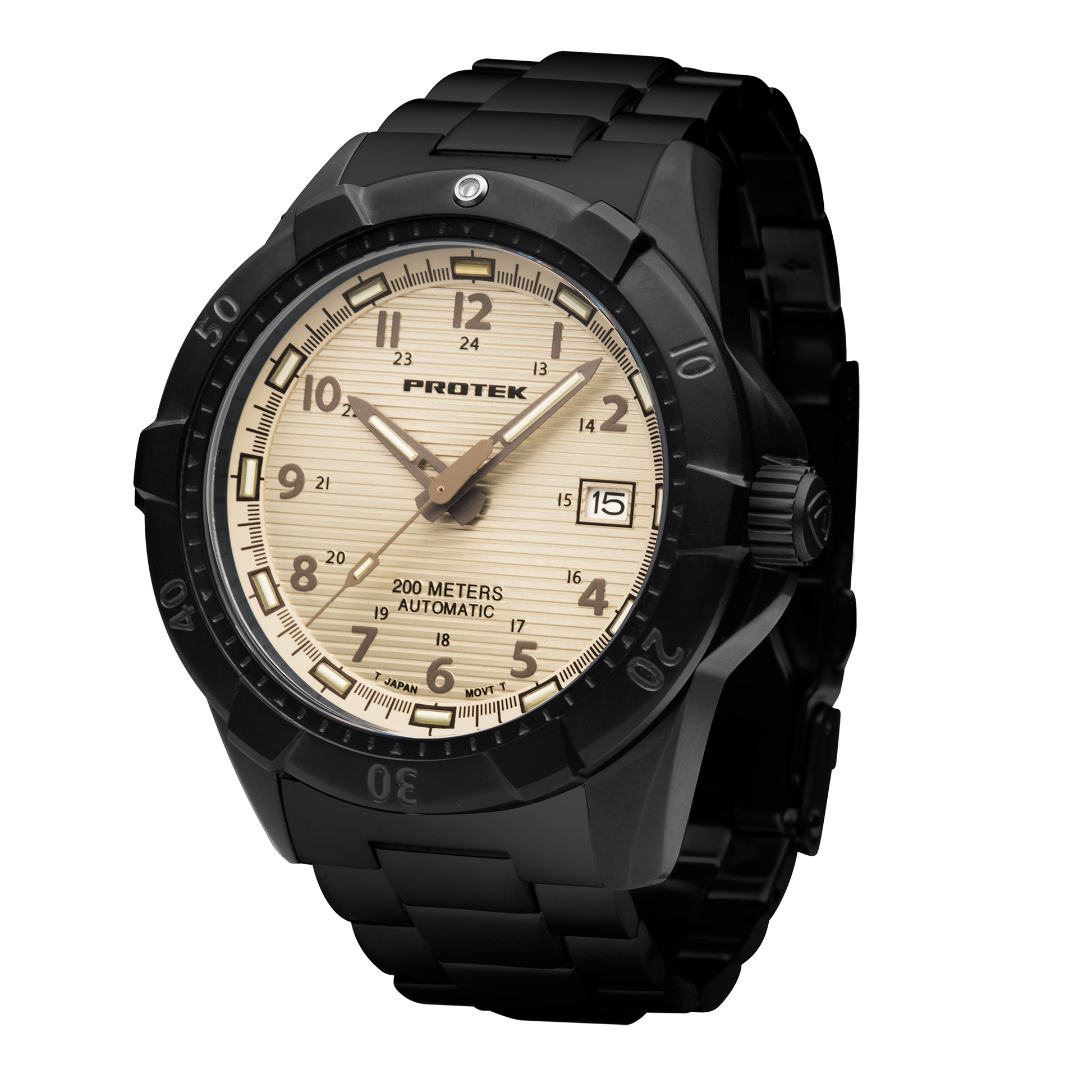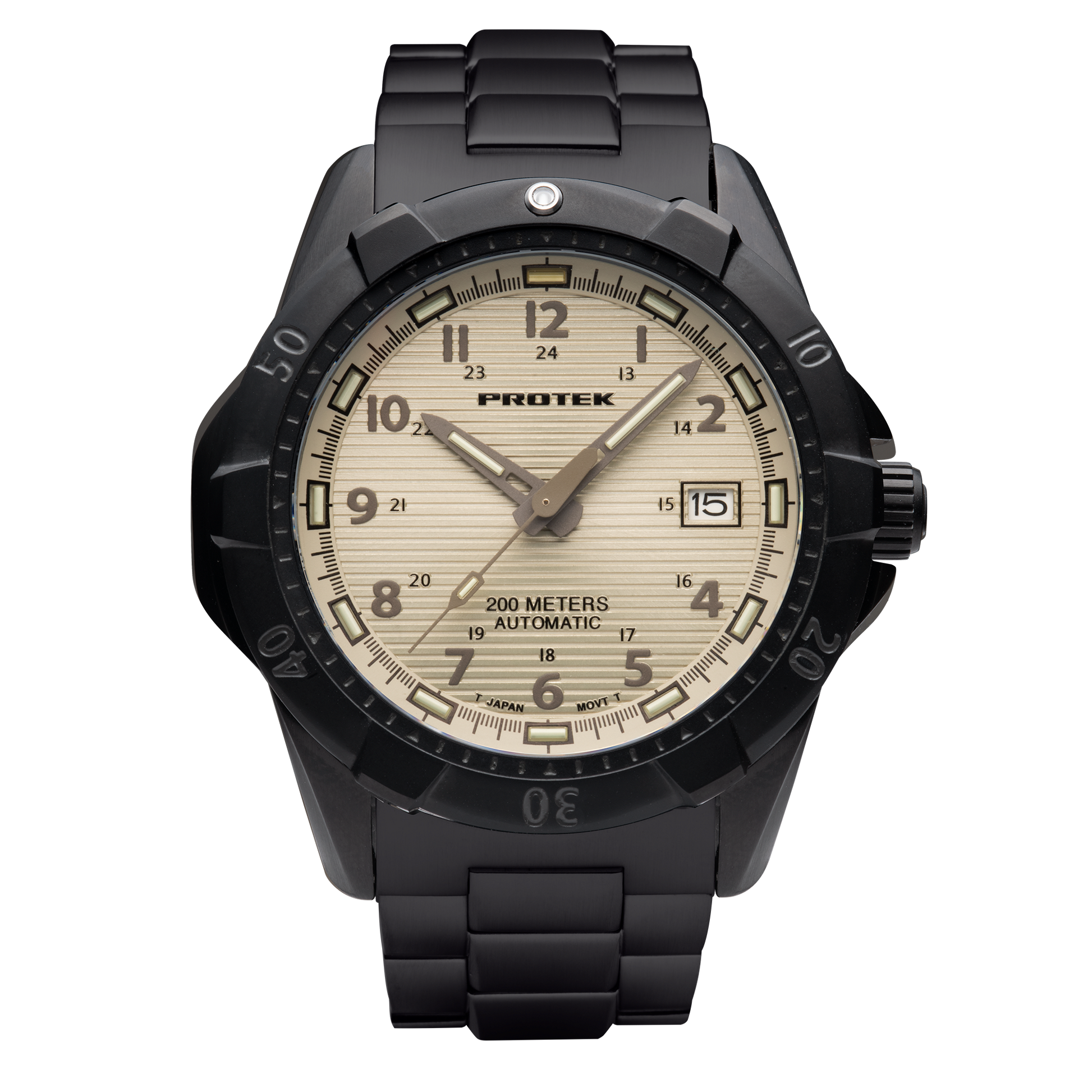 This 42mm black PVD-plated stainless steel dive watch is a sleek blend of style and functionality. Featuring a 120-click unidirectional bezel, 200-meter water resistance, and a dependable Seiko/TMI 24-jewel automatic mechanical movement, it’s designed for reliability in any environment. The Swiss Pro-Glo T25 tritium illumination ensures 25 years of continuous brightness, making it ideal for low-light conditions. Paired with a solid link stainless steel bracelet with IP Black Plating and a scratch resistant sapphire crystal, this watch delivers bold aesthetics and rugged performance.