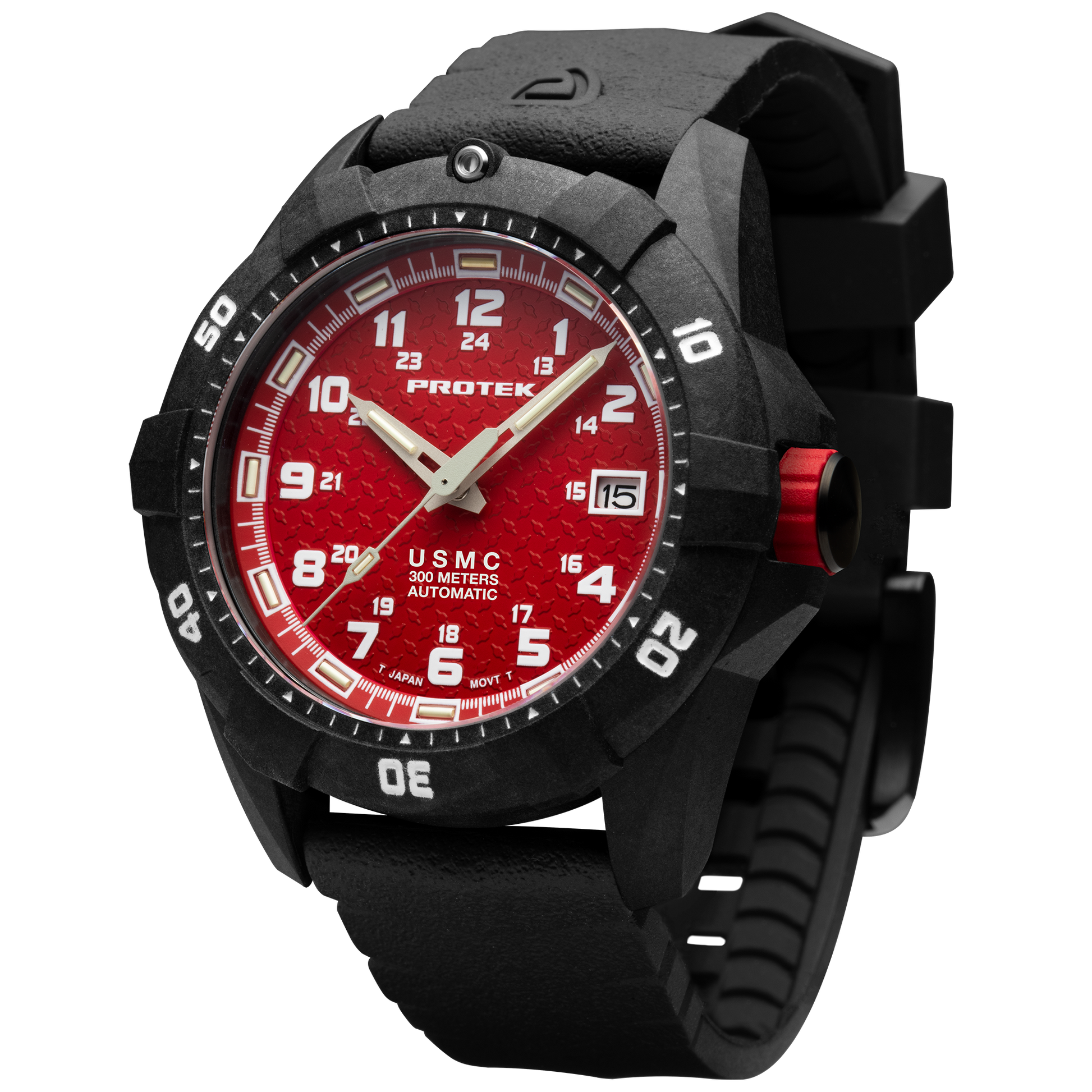 This 42mm carbon composite dive watch is built for performance and resilience, featuring a 300-meter water resistance, a unidirectional ratcheting bezel, and an embossed USMC logo on the stainless steel caseback. Powered by a reliable Seiko/TMI 24-jewel automatic mechanical movement, it delivers precise functionality with no battery required. With Swiss Pro-Glo T25 tritium illumination providing 25 years of continuous brightness and a reinforced rubber strap for added durability, this watch is the ideal companion for challenging environments.